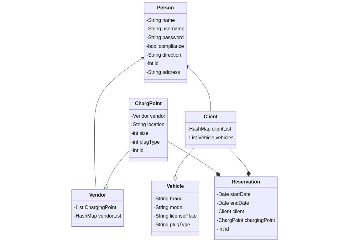 Una Person puede ser Client o Vendor con una relación de herencia. A su vez Clienttendrá 1 o más vehículos y Vendoraportará 1 o más ChargPoint.